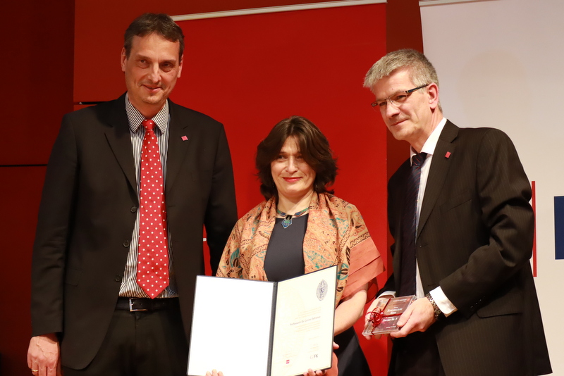 Remise du prix le 6 mai 2019, Stefan Müller-Stach, vice-président de l’université de Mayence; Corine Defrance; Thomas Hieke, directeur du Gutenberg Forschungskolleg (de gauche à droite) – Photographie: U. Pfeil