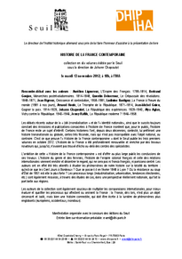 Buchvorstellung der zehnbändigen Reihe Histoire de la France contemporaine, die beim Verlag Seuil unter der Leitung von Johann Chapoutot erscheint. Podiumsdiskussion mit den Autoren der Reihe: Aurélien Lignereux, L’Empire des Français. 1799–1814, Bertrand Goujon, Monarchies postrévolutionnaires. 1814–1848, Quentin Deluermoz, Le Crépuscule des révolutions. 1848–1871, Jean Vigreux, Croissance et contestation, 1958–1981, Ludivine Bantigny, La France à l’heure du monde (1981 à nos jours), Arnaud Houte, Le Triomphe de la République. 1871–1814, Jean-Michel Guieu, Gagner la paix. 1914–1929, Johann Chapoutot, La République des expériences. 1929–1940, Alya Aglan, Vichy contre la République. 1940–1946, Jenny Raflik,  La République moderne ? 1946–1958.